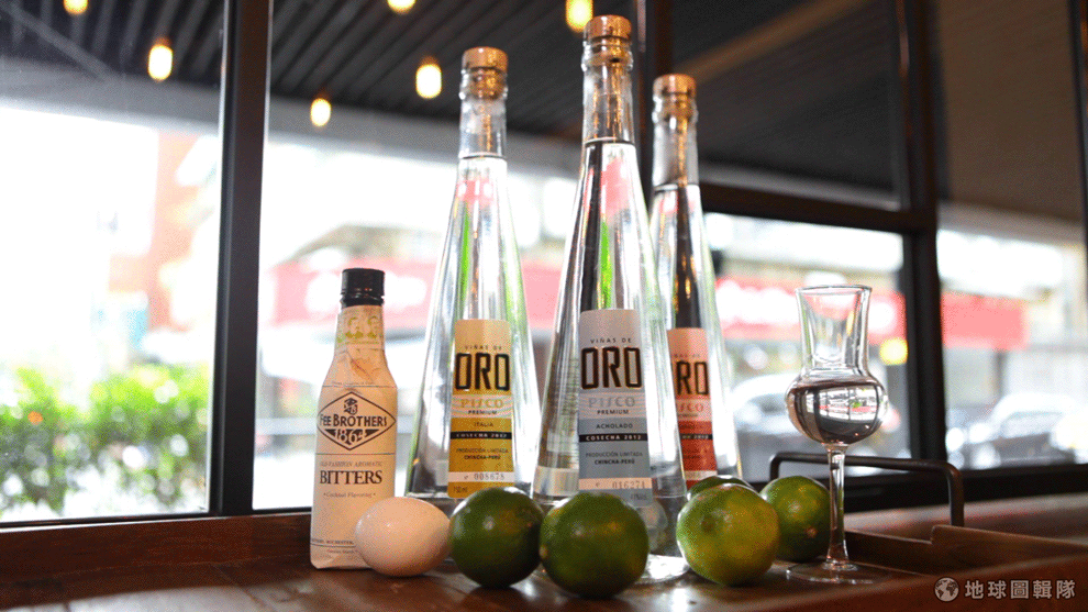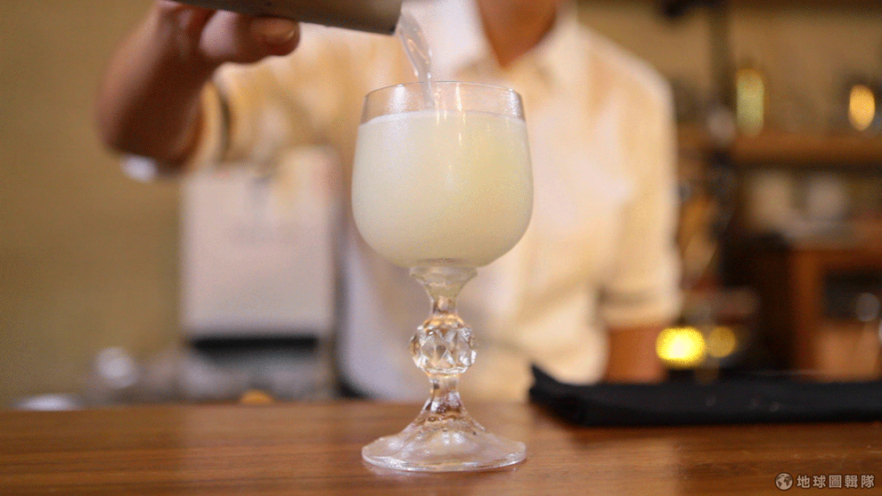 地球圖輯隊調配好的皮斯可酒香氣迷人,最後滴上的三滴苦精有去腥之效,讓酒液更好入口。