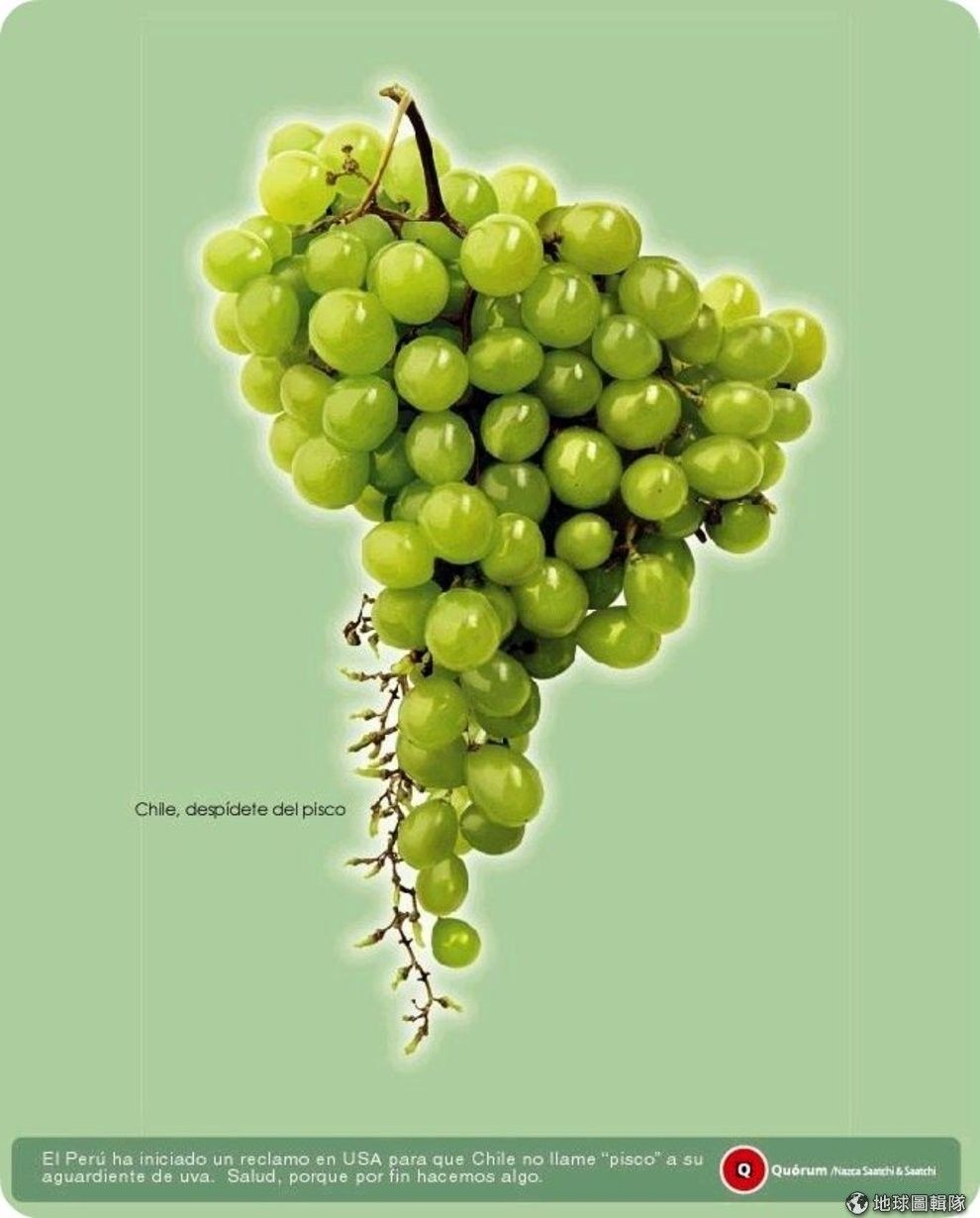 秘魯和智利的搶酒大戰白熱化,廣告中可以見到南美洲成了一串綠葡萄,唯獨狹長的智利只剩葡萄梗,一旁的文字寫道:「智利,向皮斯可酒說再見吧!」 Photo credit: Marcos GP