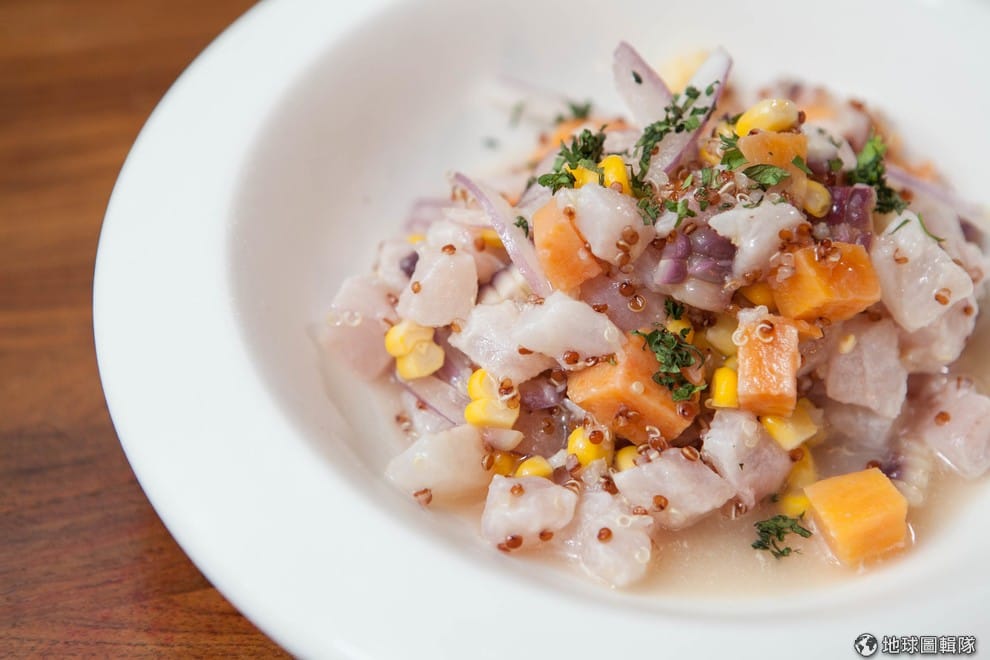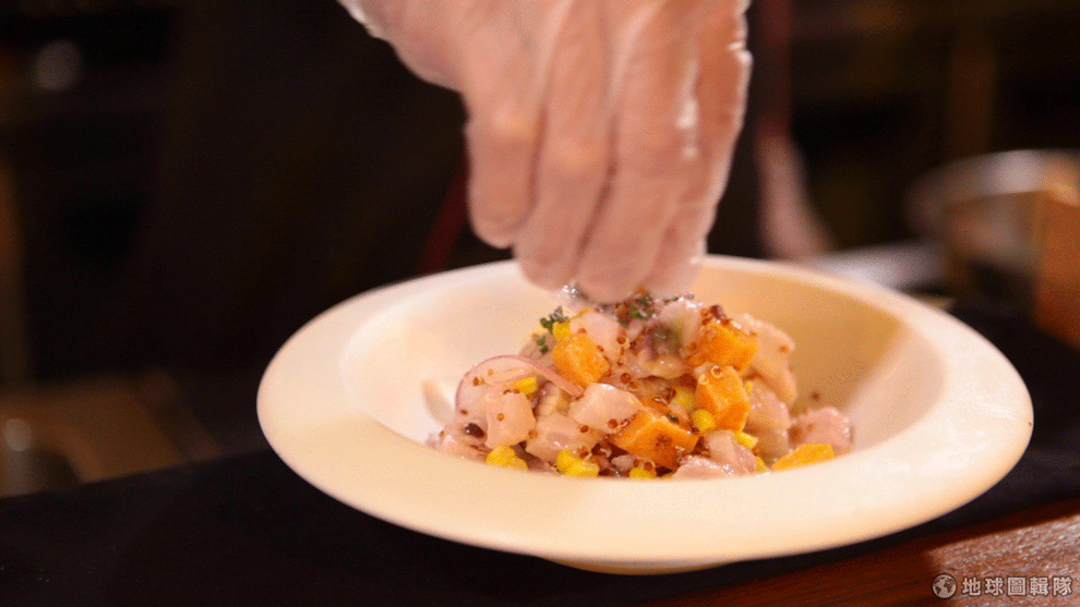 而皮斯可酸酒的絕配當屬秘魯醃生魚(Ceviche),這道料理也是秘魯國菜。只見主廚將新鮮的生魚切丁後,依照不同的季節搭配不同蔬果,像是玉米、地瓜等,之後再加入同樣是秘魯當地特產的藜麥,還有人稱「虎之奶」(leche de tigre)用海鮮高湯和蔬果熬製成的醬汁,一道清爽的秘魯醃生魚就完成了。