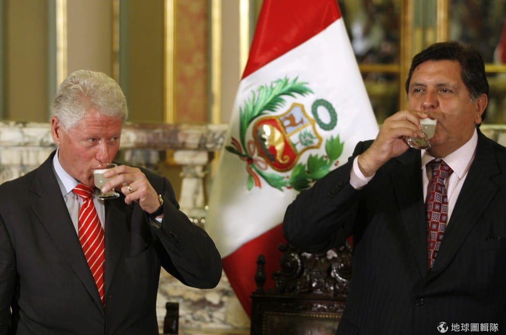 在秘魯國宴上,常常可以看到皮斯可酒的身影。圖為 2009年美國前總統柯林頓(左)出訪秘魯時,時任秘魯總統的佩雷斯特地端出以皮斯可酒調製而成的皮斯可酸酒來招待。