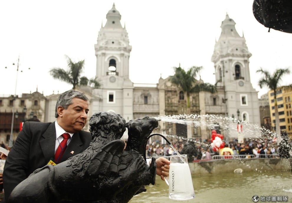 秘魯政府將每年 7月的第 4個星期天定為秘魯皮斯可節,利馬市政廳前的噴泉水全部換成皮斯可酒,一名男子手拿容器開心裝滿皮斯可酒。