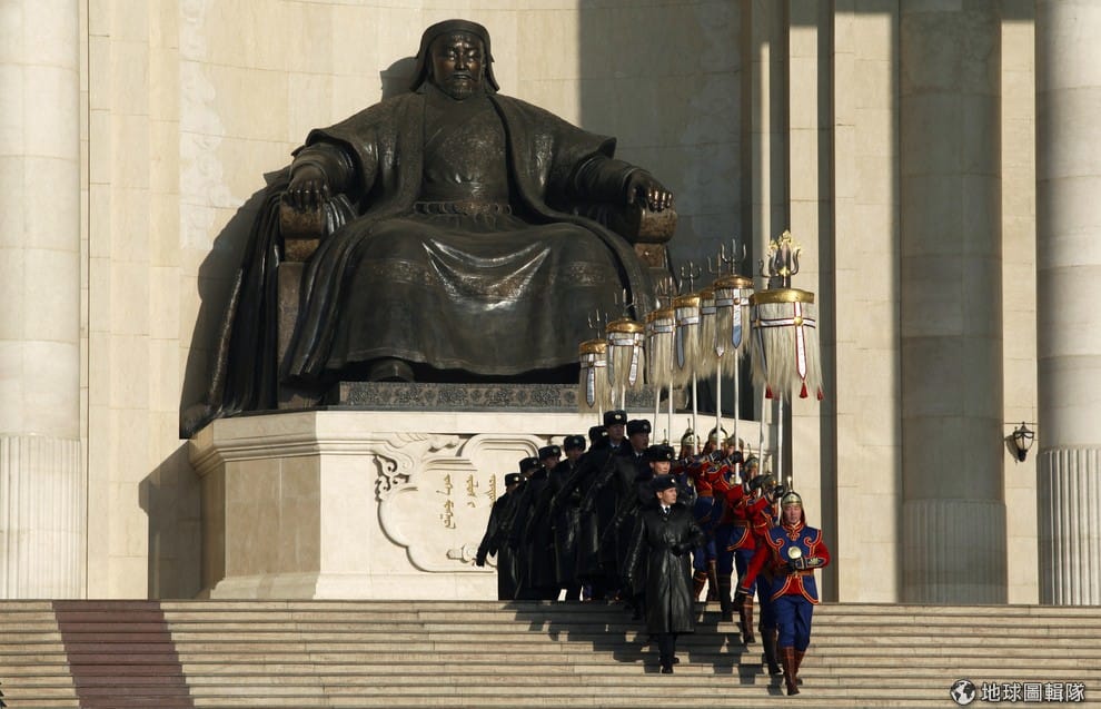 一列身穿古代戰袍的衛兵走過蒙古議會前的成吉思汗雕像。