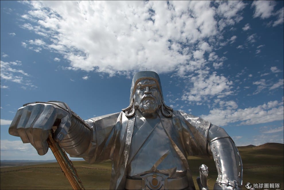 圖為位於蒙古的成吉思汗塑像,它的身後襯著藍天白雲和綠地。Photo credit: Ludovic Hirlimann