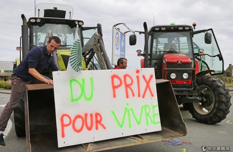 這場抗議也反映出法國農業的三重危機(註1)。去年,法國乳品、牛肉和豬肉畜牧業者就已經因為收購價下跌而苦。價格下跌的背後原因很多,不過,農民不再有歐盟補貼來提振市場。過去十年來,歐盟承諾的固定收購價以及盈餘逐漸崩解。