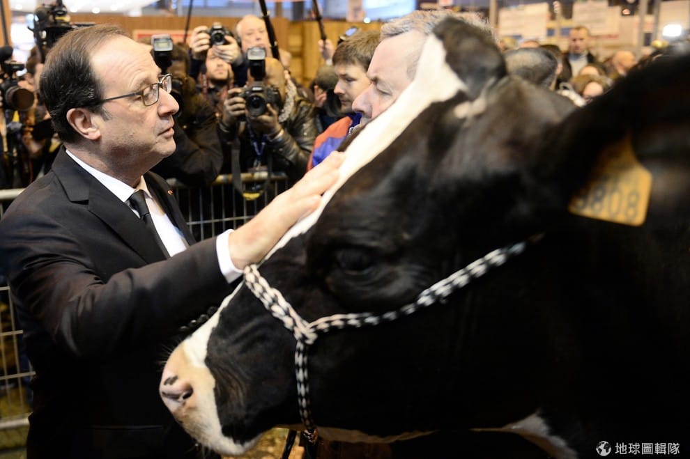 全球乳品生產過剩讓酪農日子不好過。圖為法國總統歐蘭德在今年於巴黎舉辦的國際農業展上,邊摸著乳牛邊和酪農對話。