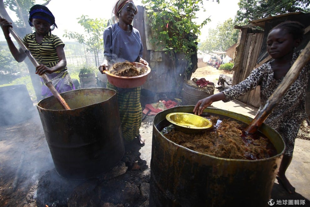 非洲居民分工合作,想辦法將剛摘回來的棕櫚果提煉成棕櫚油。