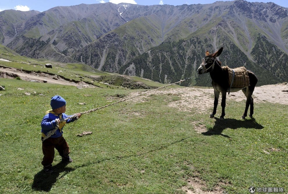 中國官媒指出,逃離中國的維吾爾人是效忠伊斯蘭國的宗教激進分子。圖中一名維吾爾小男孩正在跟動也不動的驢子奮戰。