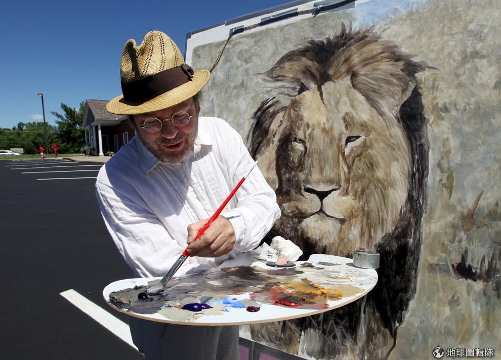 藝術家Mark Balma在診所外畫畫,悼念被殺死的賽西爾。