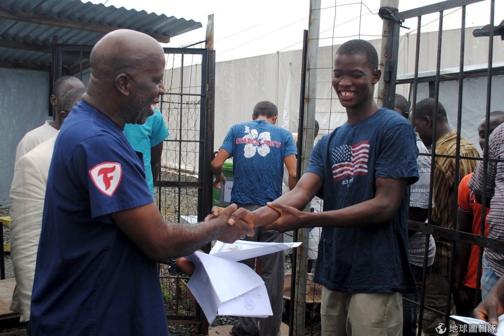 7月20日這天,終於能離開隔離區的民眾(右)忍不住和醫療人員握手,一臉笑意。