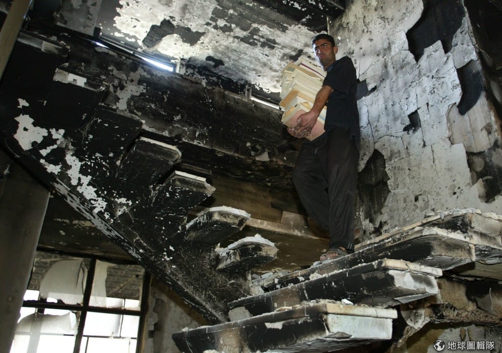 2003年,美國出兵伊拉克,造成當地許多建物受到波及被毀,圖為正在收拾殘局的巴格達大學圖書館館員。