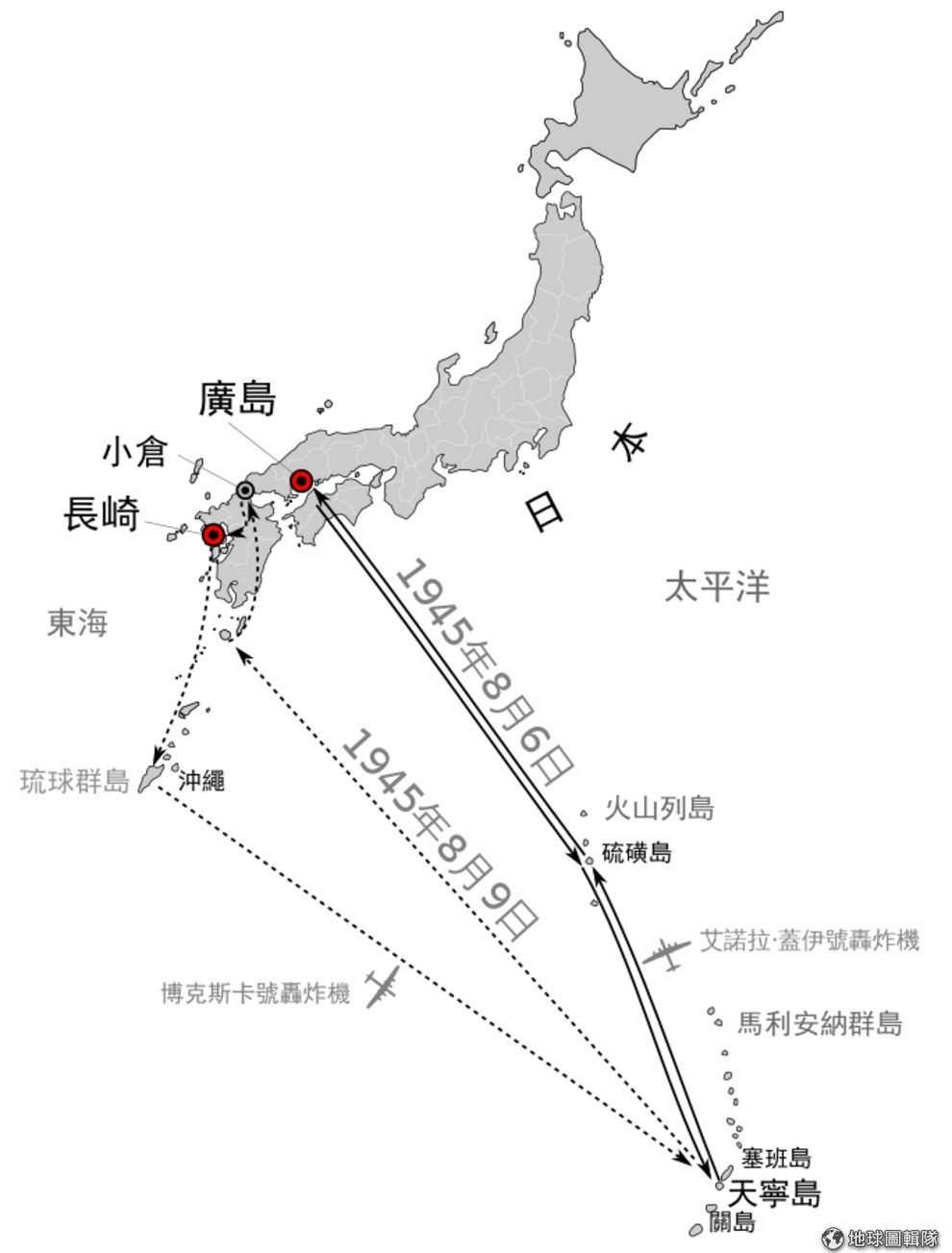 美軍在8月6日至9日間對廣島與長崎進行轟炸的路線,原本預計的轟炸目標為小倉。Photo credit: wikicommons