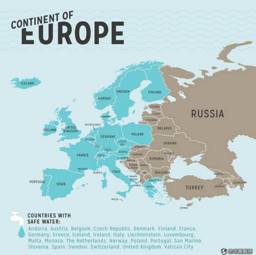 註:根據NeoMam Studio的資料,英國的水是可以生飲的。圖中藍色區域代表自來水可生飲的歐洲國家,灰色則代表不可生飲。