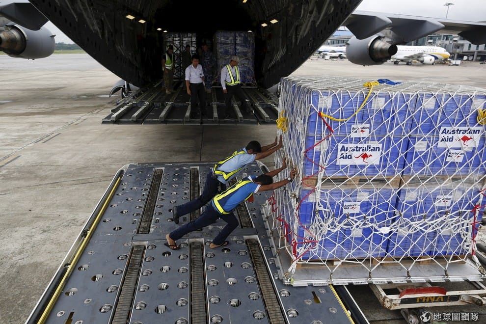 路透社緬甸的仰光機場內,澳洲來的物資正從貨機上卸下。