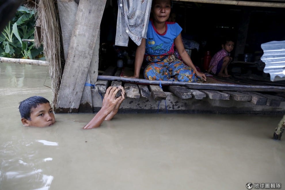 緬甸澤倫區的村民因為大水受困家中,圖中的男孩正從水中探出頭來。