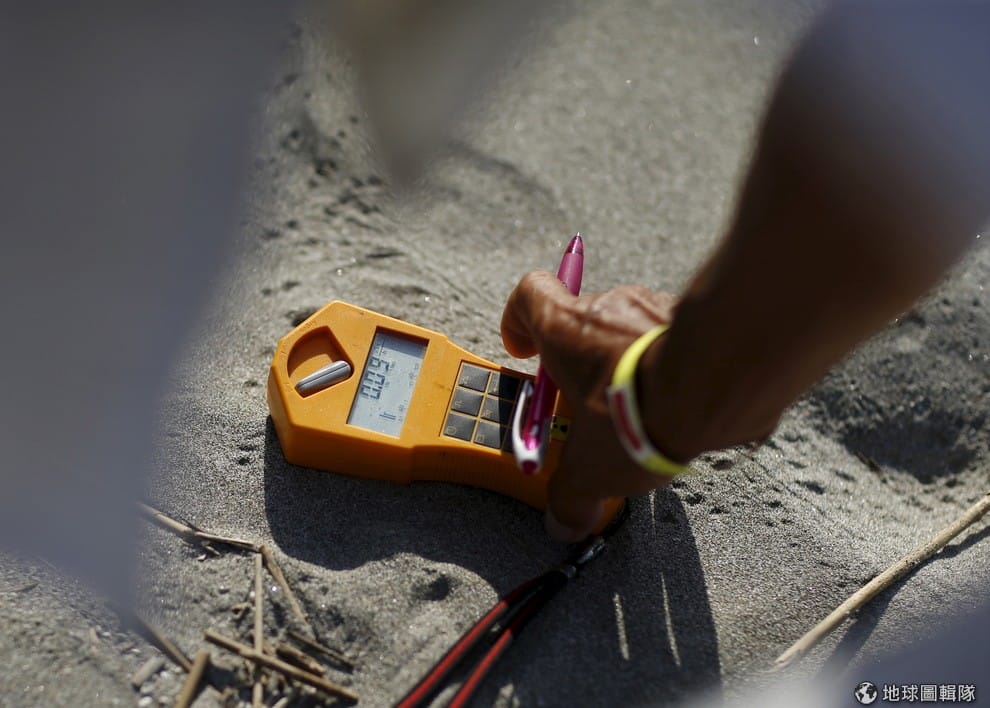 抗議民眾把輻射測量器放在抗議陣營外的土地上。