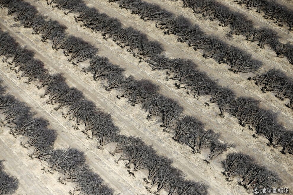 加州的旱季已經持續多時,圖為科靈加一處扁桃樹園區,樹木因為旱季全枯萎,景象驚人。