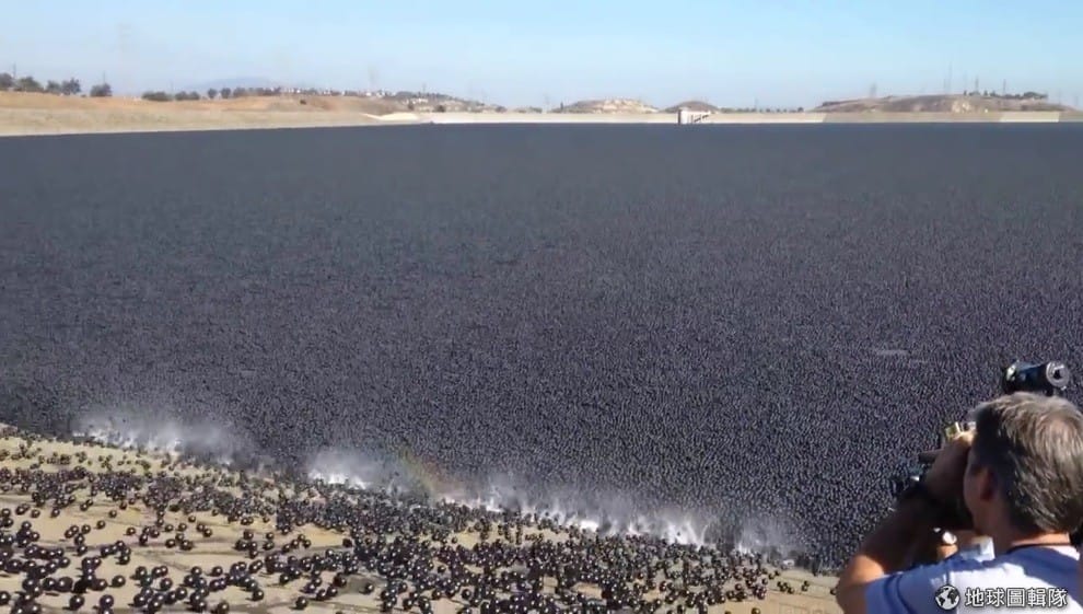 美國加州的保水妙招:洛杉磯市政府把將近上億顆的黑色塑膠「遮陽球」(Shades ball)倒入水庫,這一顆顆的黑球其實是當地想出來的保水方式,他們利用塗滿化學物抗UV的塑膠球覆蓋水面,降低水分蒸散的速度,同時還能保持水源不受雨水、塵土砂石和鳥糞的汙染,就連太陽照射引發的化學變化也可以減輕。