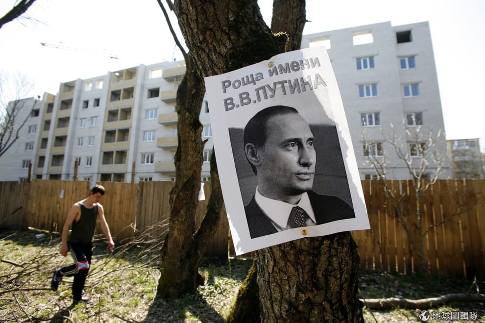 與俄國政府相關的出版品目前有可能會受到查禁,印有俄國現任總統普亭肖像的傳單釘在樹上。