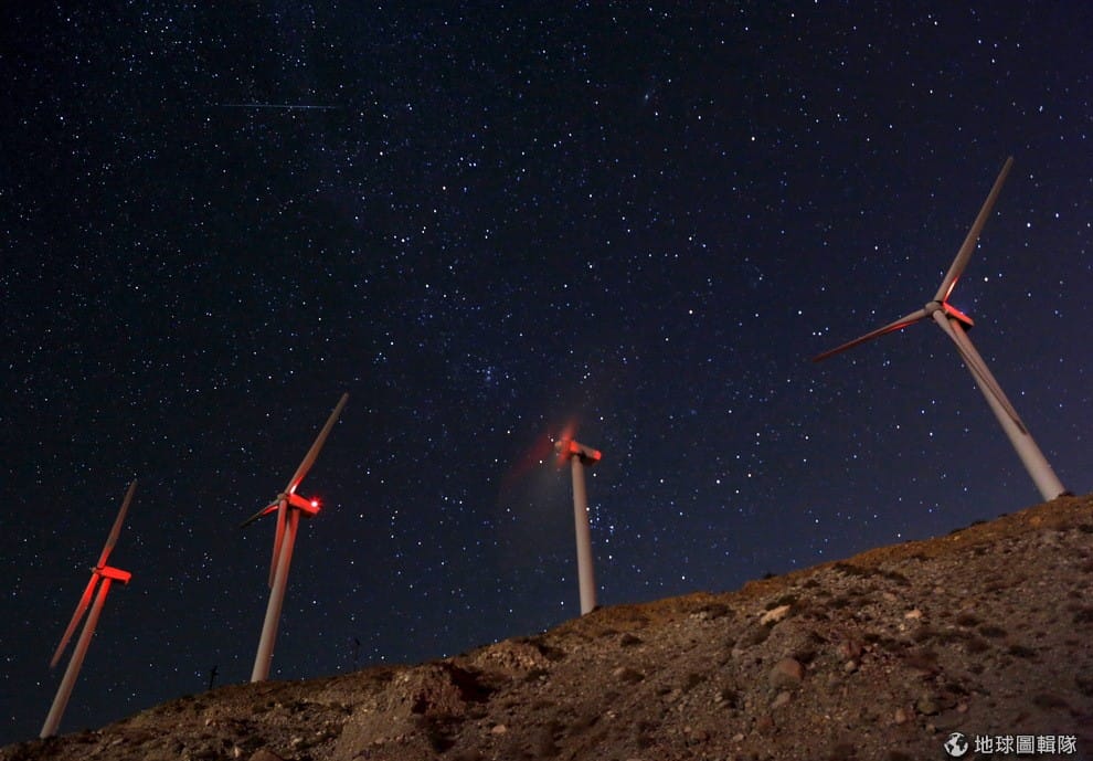 美國加州-聖歌爾哥尼奧風力發電廠(San Gregornio Pass Wind Farm)是不少攝影迷愛拍的景點,3號時也可以見到流星劃過夜空。