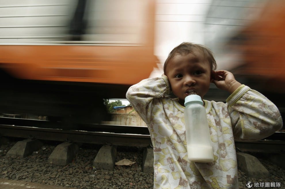 對不少印尼人來說,政府砸錢興建高鐵還不如先拿錢來拯救民生。圖為一名住在雅加達外圍貧民窟的小男孩,他站在轟轟開過的列車前喝著牛奶。