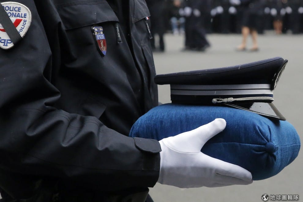 警察米拉貝在圍攻槍手的過程中,不幸被射殺,圖為一名法國警察捧著米拉貝的警帽。