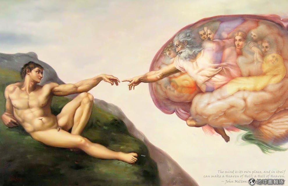 培養人類大腦不免會引發倫理上的爭議。圖為義大利文藝復興大師米開朗基羅的作品《創世紀》,其中右半邊上帝的部分被換成了大腦。Photo credit: Tom Blackwell