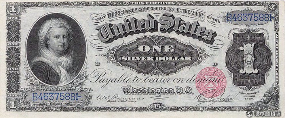 1886年一美元鈔票和瑪莎.華盛頓。