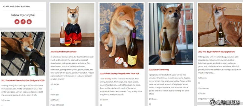 柴犬SUKI是紐約的葡萄酒侍酒師,以部落格來評鑑全球各地各種等級的葡萄酒。 取自Shiba Sommelier