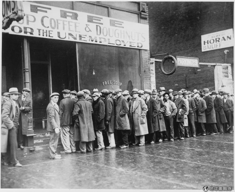 1929年美國經濟大蕭條,街頭充滿了失業民眾聚在餐廳前等著領免費的食物。Photo credit: WikiCommons
