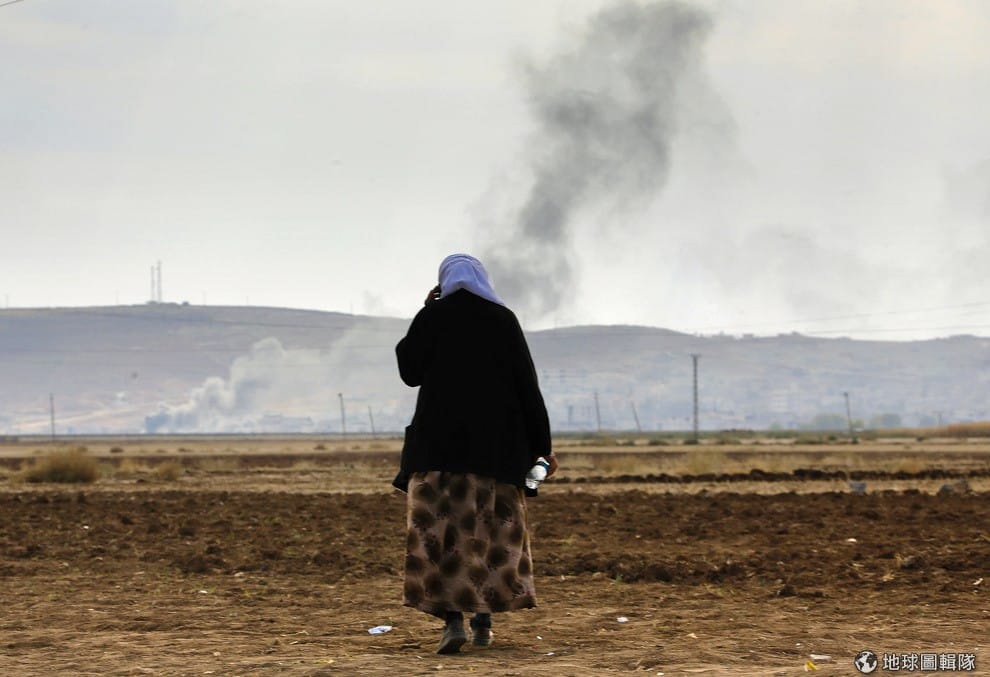 一名敘利亞女子通過邊界逃到土耳其,她遠遠看著自己的家園被戰火催毀。