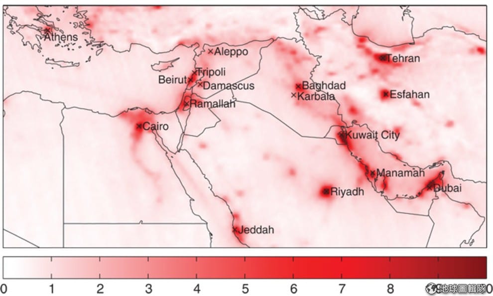 圖為 2005-2014年,中東地區的二氧化氮含量分布,顏色越紅的地方代表二氧化氮的含量越高。從圖中可以看到,越多人聚集的地方二氧化氮含量越高。Photo credit: Jos Lelieveld