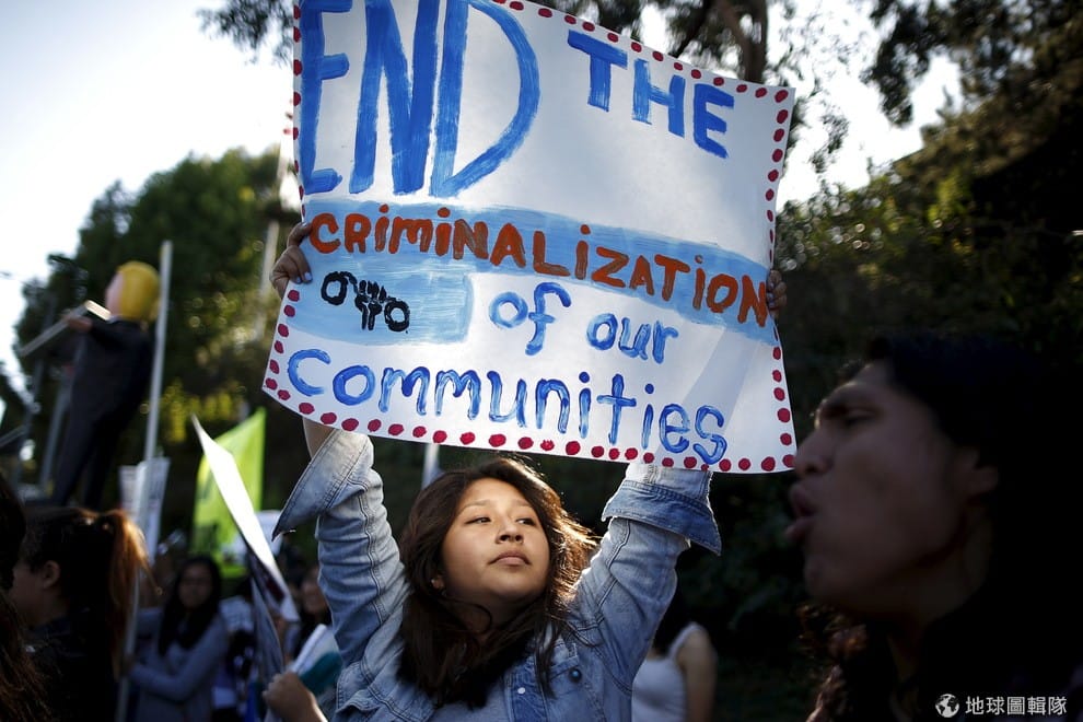 抗議川普失言的民眾高舉標語「停止把我們犯罪化」,川普日前提到墨西哥人帶給美國許多犯罪問題引發爭議。
