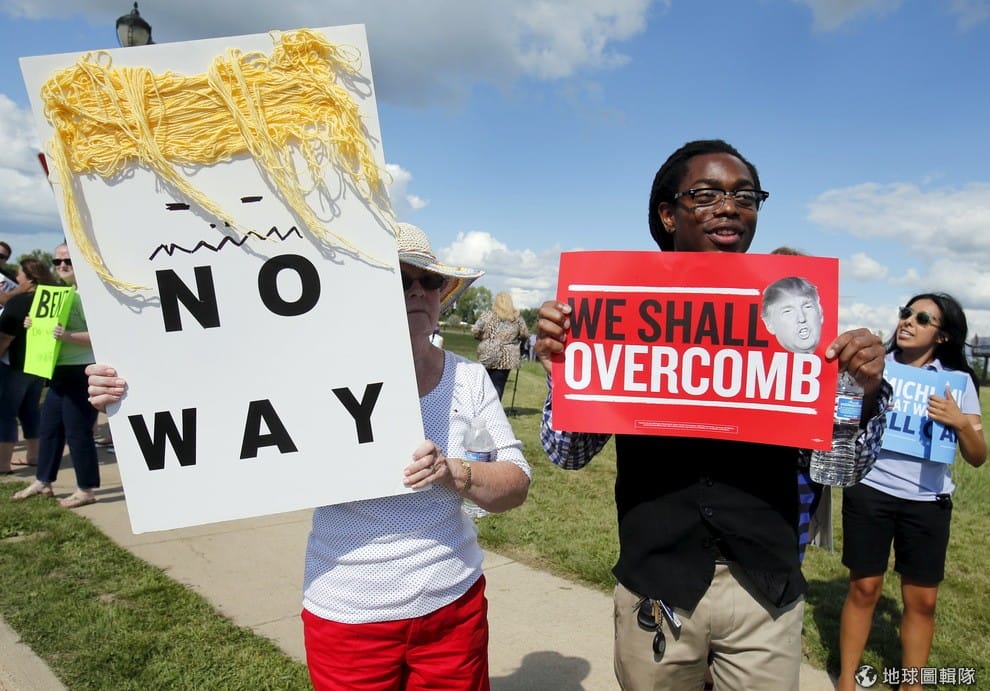 抗議川普的民眾舉著標語,上面有許多拿川普髮型開玩笑的內容,一面寫著「不可能」的標語上貼上了黃色的長髮諷刺川普的金色劉海,另一塊板子則寫上「川普你梳定了」(註:overcome原指征服、克服,民眾改字尾變成overcomb,comb有梳頭之意。此處譯文為意譯。)