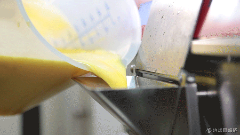 纖維被瀝乾淨後的芒果泥散發自然清香,再加入清水、砂糖還有冰淇淋粉,就可以倒入冰淇淋機等待雪酪出爐囉!
