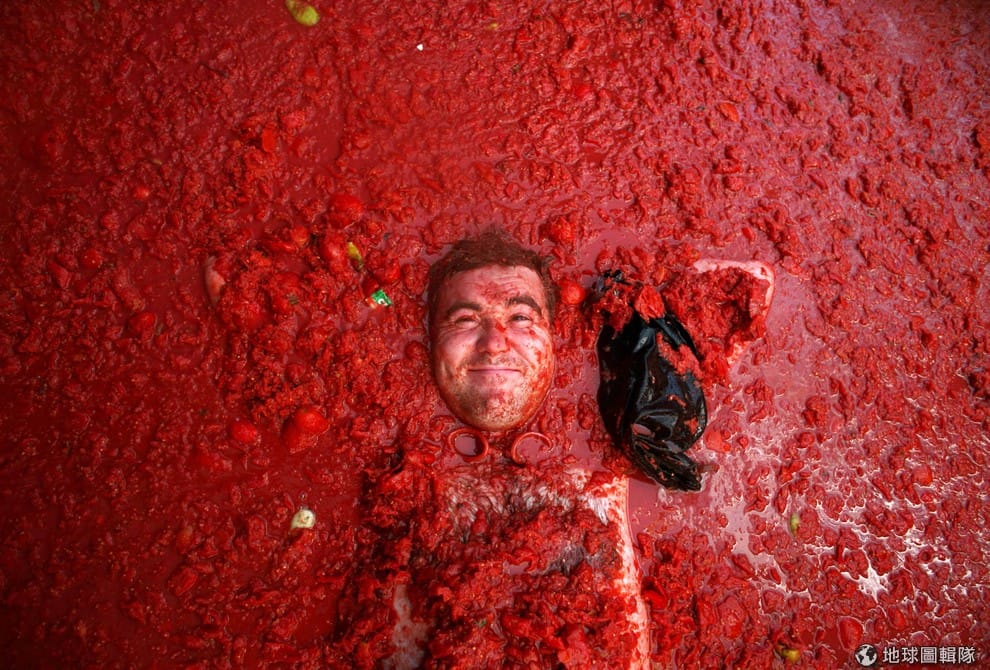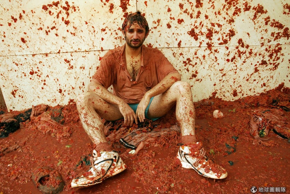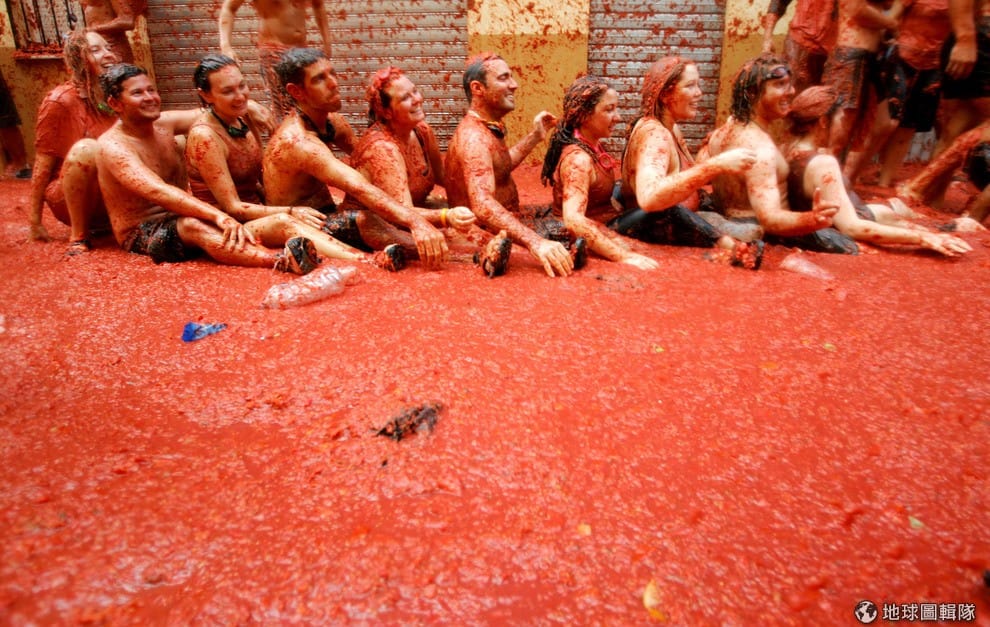 路透社根據當地統計, 2015年的參加者有 20%來自西班牙,英國遊客則佔15%,來自日本的也有 10%,印度 9%,澳洲 5%,美國遊客也佔了些許。圖為砸到累的遊客,直接躺進滿滿的番茄糊中。