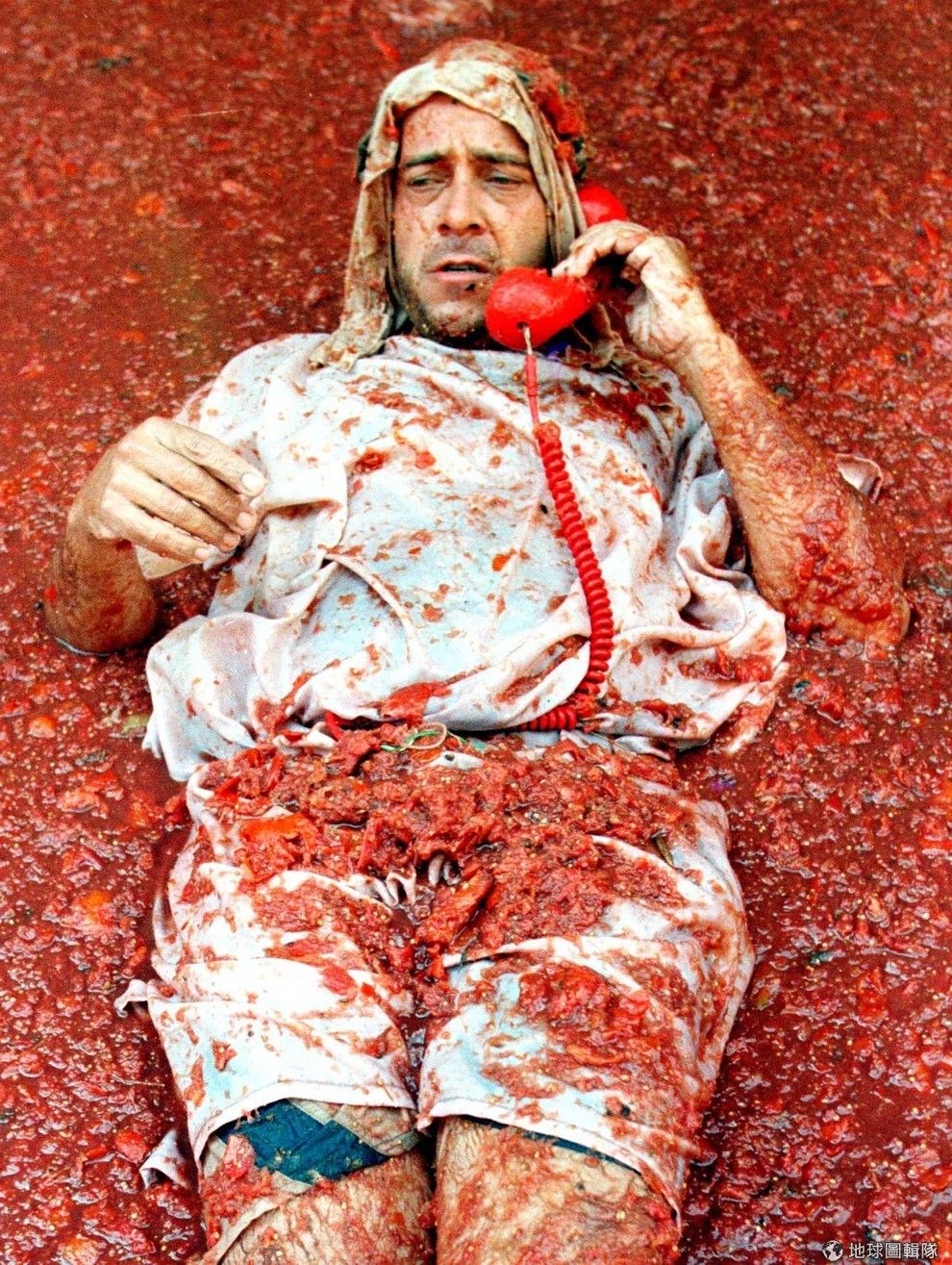 路透社番茄節準備百噸番茄讓參加者砸,地面上的番茄泥已經多到可以把瓶罐淹過去的程度,所有參加者都是滿身豔紅。每年為了迎接這樣的盛事,布尼奧爾鎮的店家在活動開始前會把房子外好好蓋住或做好關好大門。