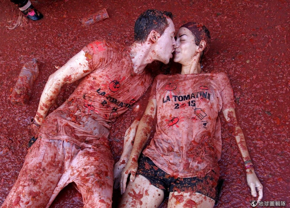 參戰的情侶被番茄染上了茄紅色,他們的上衣寫的 2015西班牙番茄節。