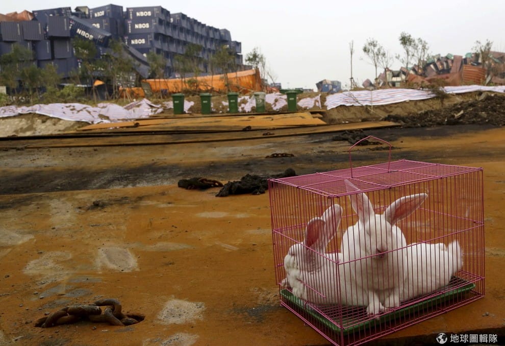 中國當局在天津大爆炸後,將兔子、雞和鴿子等動物送進災區兩小時,觀察該區的化學汙染有害狀況,中國當局表示,動物回來後都還是活著的。
