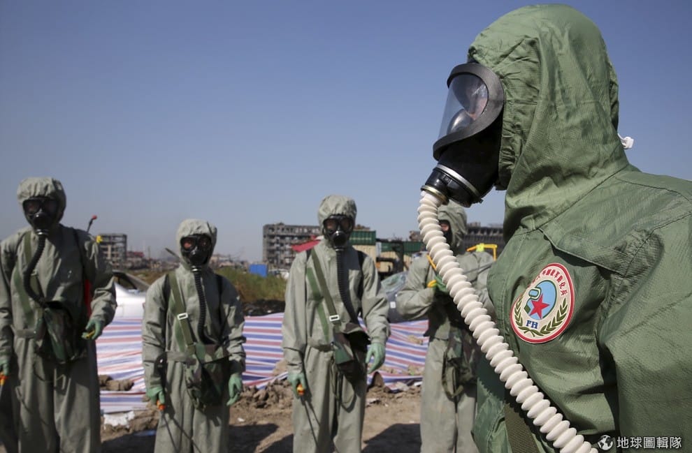 穿上保護衣的人民解放軍,正準備進入災區進行清理善後作業。