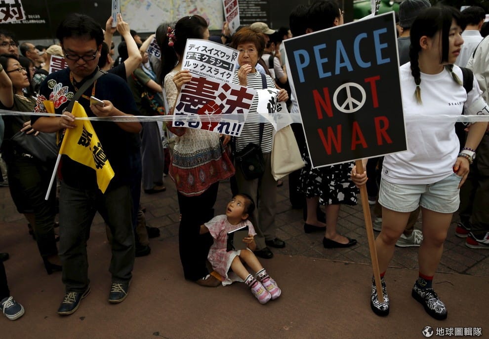除了違憲,民眾也擔心一旦新法通過有可能將日本拖入不必要的戰爭。目前日本參議院正針對新法展開辯論,有可能在九月通過新安保法,不過就算參議院不通過,新安保法也會回到眾議院進行二次投票,要是二次投票通過,新安保法將正式立法。