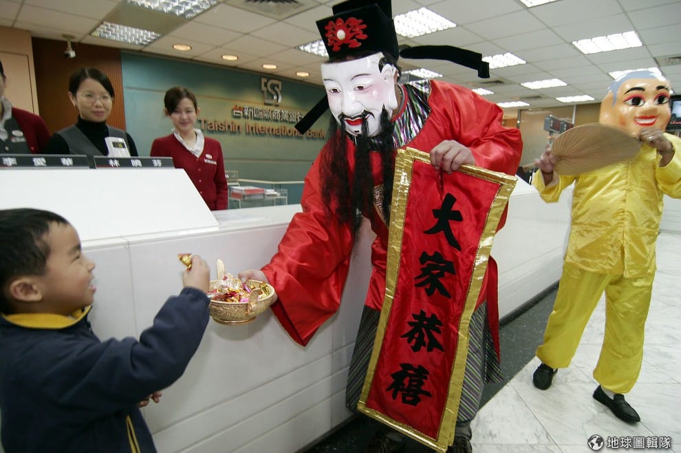 一名小男孩開心地向財神爺領糖果。