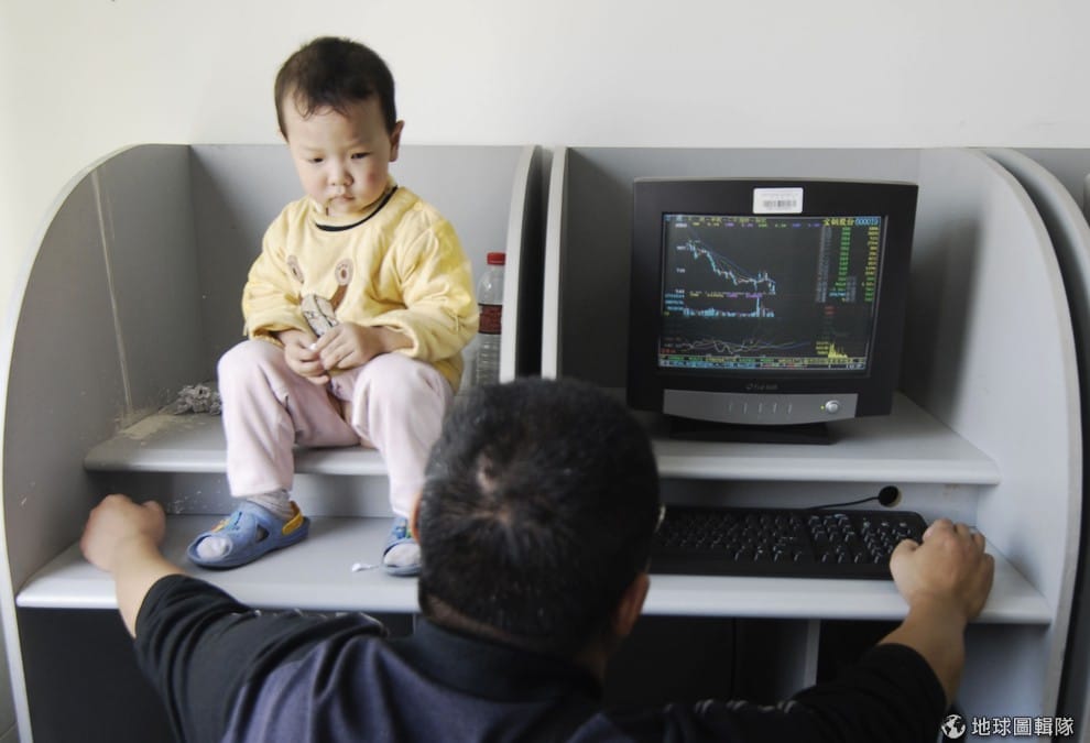 一名中國股民專心地看盤,他的女兒坐在一旁。