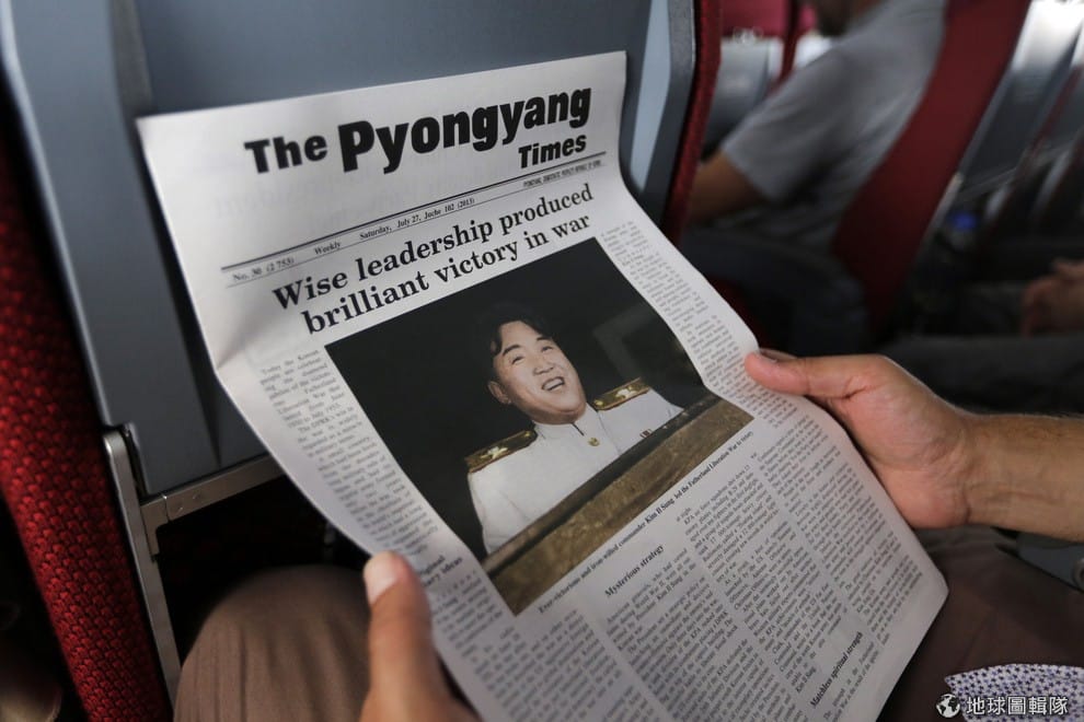 飛機上有提供宣揚國威的英文版《平壤時報》,封面印著北韓前領導人金日成的照片。