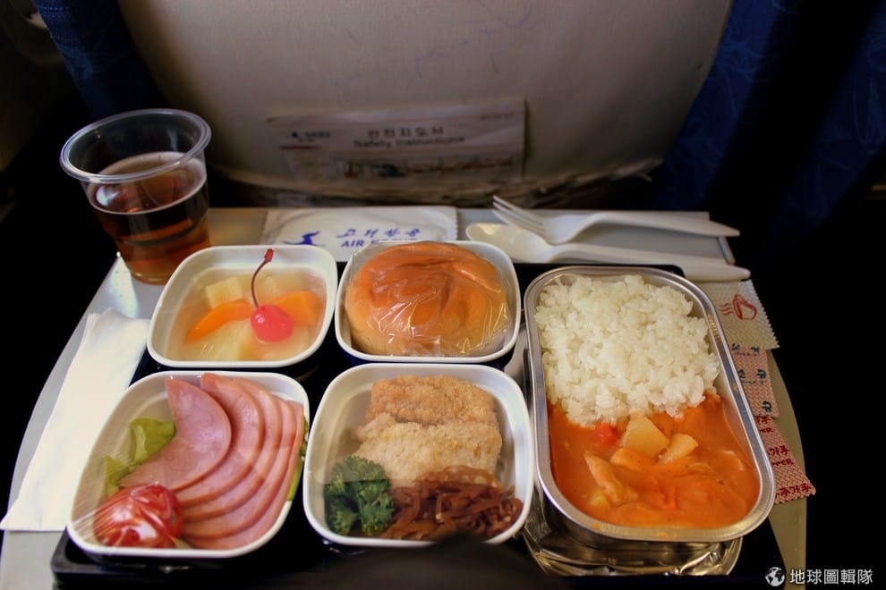 圖為北韓高麗航空的機艙情形,穿著紅色制服的空服員正在送餐。Photo credit: (stephan)