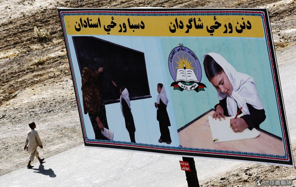 一名男孩走過一面大看板,看板上寫著鼓勵阿富汗女孩上學的文字。