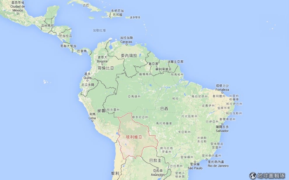 圖中紅色區塊為南美內陸國玻利維亞,他被祕魯、智利、阿根廷、巴拉圭和巴西包圍,國內瀰漫濃厚的社會主義左派氣息。