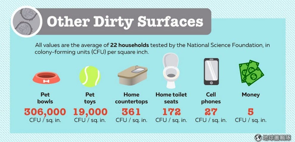 根據美國國家科學基金會調查了 22個家庭得出的平均數據,錢居然是調查物品中最不髒的,每平方英寸只有 5個CFU。人們常常使用的手機每平方英寸有 27個CFU,馬桶蓋則是 172個,廚房檯面有 361個,再來就是最髒的寵物玩具和飼料盆了,分別是 1萬9千個CFU還有 30萬6千個CFU,整整是機上用餐板的 140多倍。