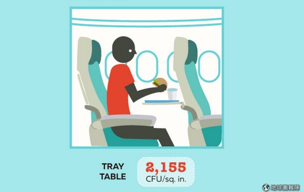 網友在這次實驗中,機上最髒的地方居然是我們面前的用餐板,每平方英寸有 2,155個CFU,整整是安全帶扣的十倍。用餐板細菌這麼多很有可能讓你病從口入,建議隨身攜帶殺菌液,只要碰到細菌滋生的表面就趕快消毒。此外,用餐板不僅是機上最髒的地方,在Travelmath調查的機場還有機艙物品中,也位居第一。Photo credit: Travelmath