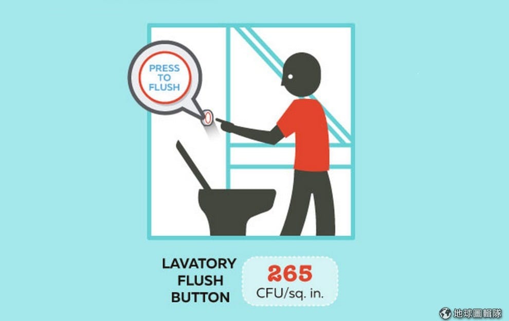 網友其次,許多人常常以為很髒的機上廁所沖水鈕得出的數據是每平方英寸 265個CFU。Photo credit: Travelmath
