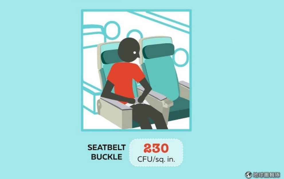 首先,這次調查中最不髒的是安全帶扣,每平方英寸只有 230個菌落形成單位(CFU)。Photo credit: Travelmath